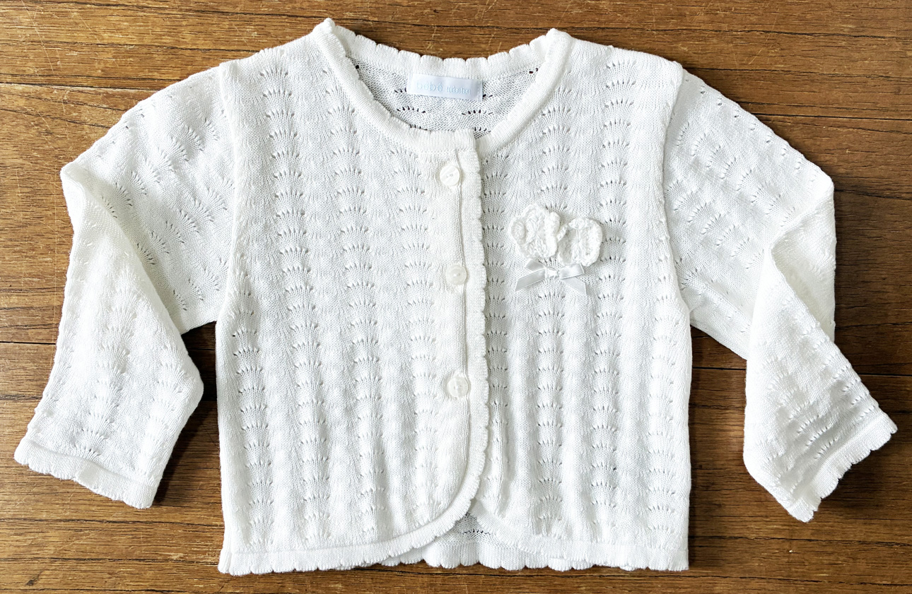 手編み風、お花のモチーフの付いたKPのカーディガン。