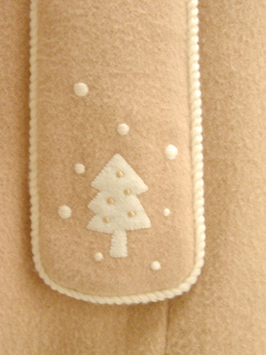 襟とお揃いのこげ茶のスウェードのリボンが付いたマフラー付き。