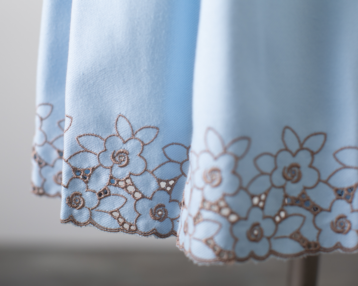 襟とすそにお花のレース刺繍が縁取られ、とても清楚な雰囲気の着やすいドレスです。.:*☆